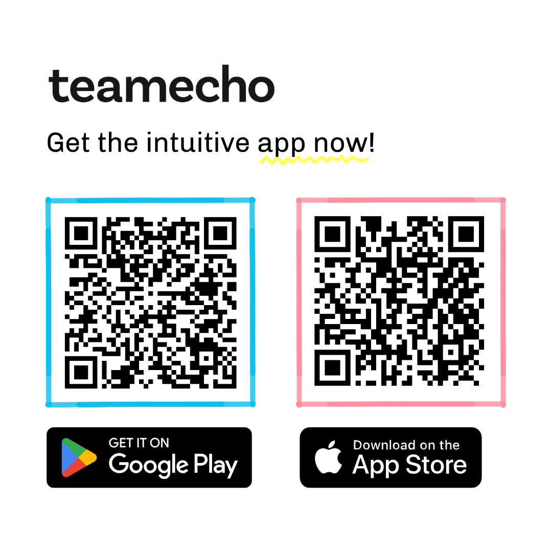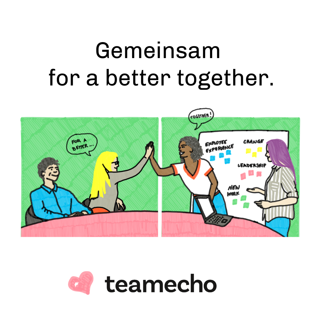 teamecho starter package Find our starter package here to accompany your introductory phase. For teamecho admins: the guide checklist for your start with teamecho teamecho announce by e-mail For managers and employees: registration in teamecho info sheet employee information sheet employee presentation Videos for your start: (please note: our videos are german with english subtitles) Onboarding Plus Führungskräfte Onboarding Plus Mitarbeiter*innen For employees: Rules of the game Rules of the game video Für Marketing: Logo teamecho & Logo te Posting Image "For a better together" LinkedIn Post Stickers QR Code for Login QR Code for App Download